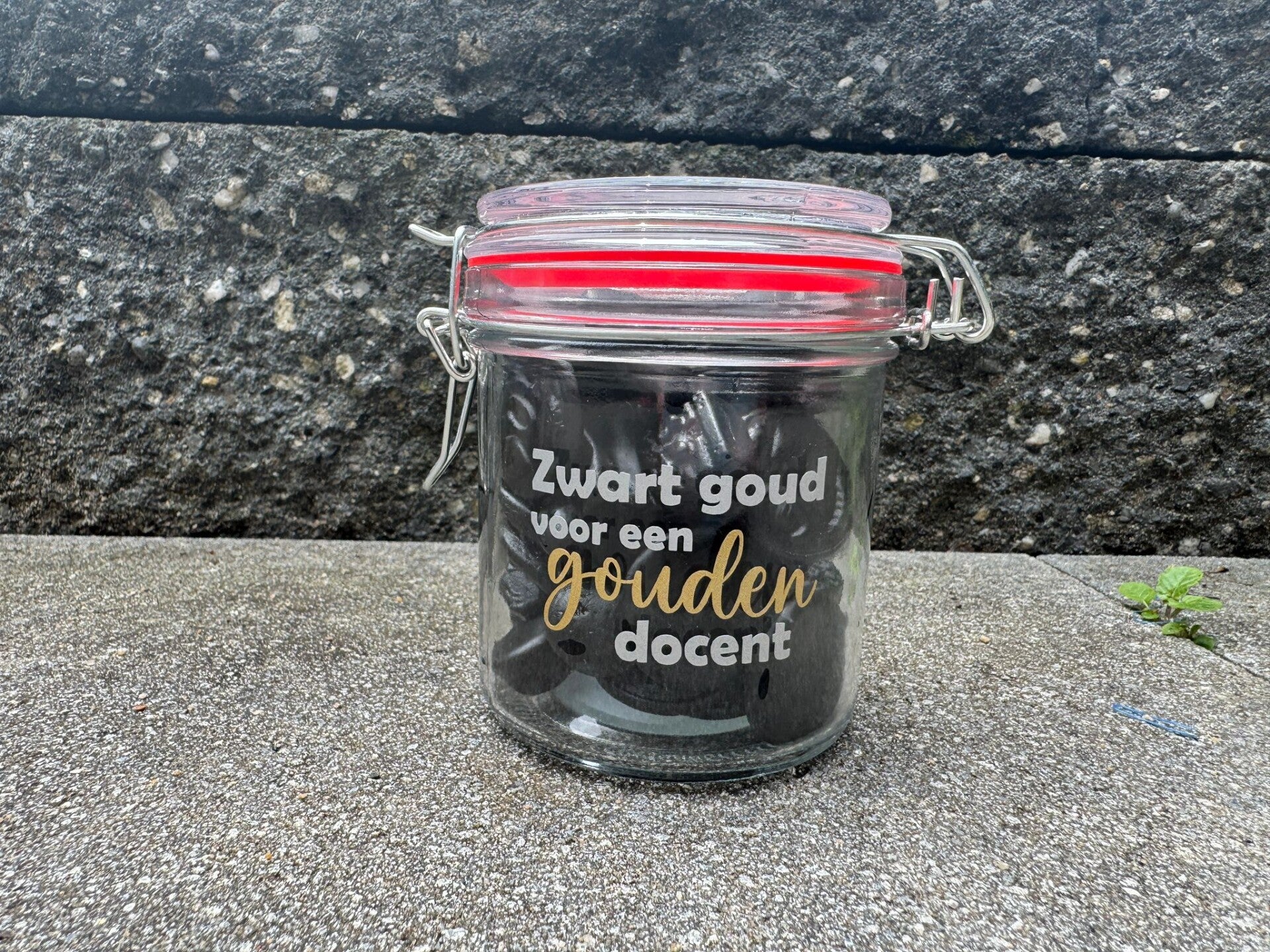 Dit gevulde weckpotje met heerlijke dropjes is het perfecte cadeautje voor het einde van het schooljaar. Met de tekst “Zwart goud voor een gouden docent” zet je de juf of meester op een originele manier in het zonnetje.