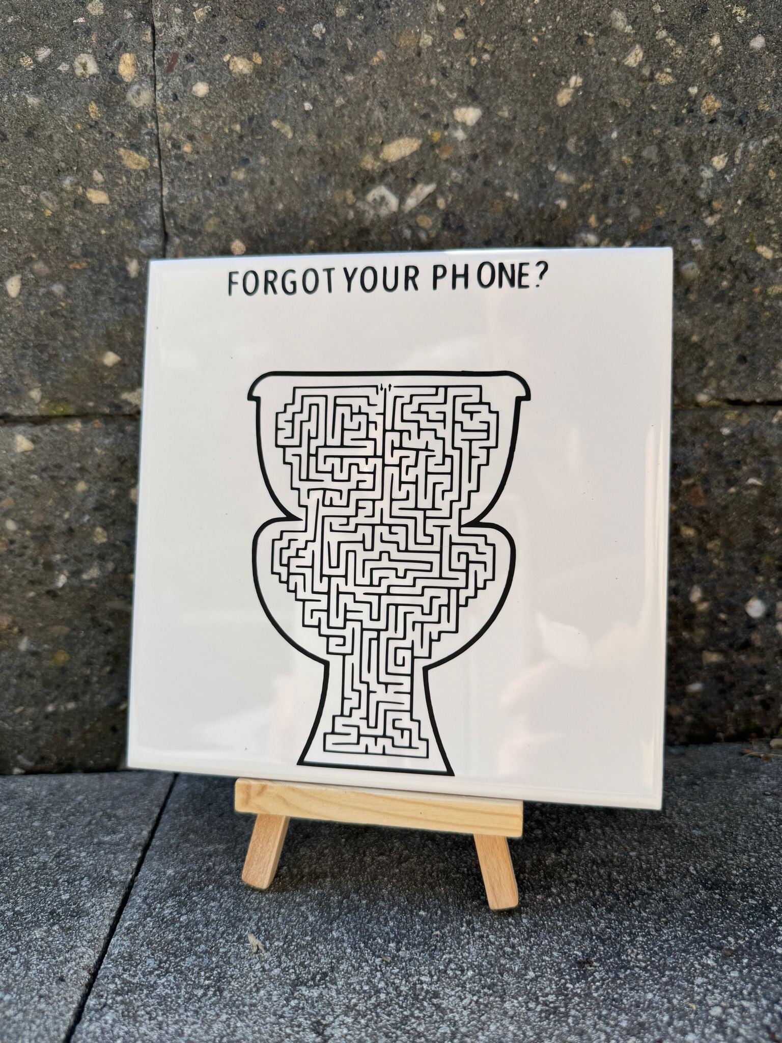 Dit 15x15 cm keramieken tegeltje is perfect voor op het kleinste kamertje. Met de tekst “Forgot your phone?” en een grappige doolhof erop, is zelfs een snelle plaspauze ineens een uitdaging. Ideaal voor gasten met ontwenningsverschijnselen van hun scherm