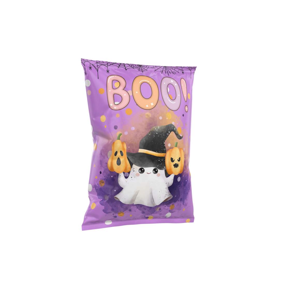 Hoe schattig is dit?! Een compleet chipszakje met paarse Halloween-wikkel, versierd met een lief spookje en de tekst “BOO”. Kant en klaar geleverd, zodat je het direct kunt uitdelen zonder zelf te knutselen.