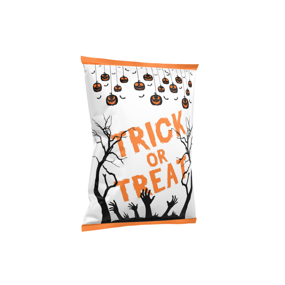 Verras jouw gasten of traktatie-ontvangers met dit spannende Halloween chipszakje! Het zakje is kant en klaar gevuld en bedrukt met een stoer design vol pompoenen, griezelige bomen en de tekst “Trick or Treat”.