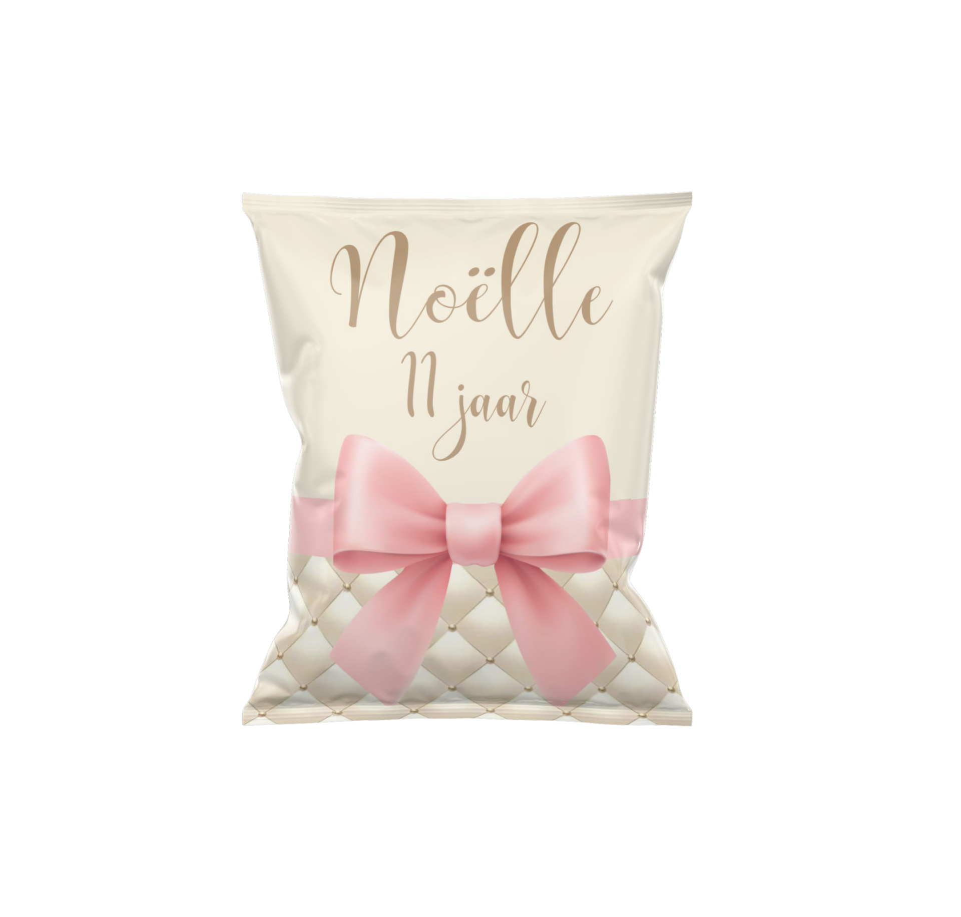 Maak elke traktatie onvergetelijk met onze prachtige gepersonaliseerde chipswikkel. Deze elegante wikkel, compleet met naam, leeftijd én een stijlvolle strik, is gevuld met een heerlijk zakje chips. Perfect als kant-en-klare traktatie voor verjaardagen, feestjes of speciale momenten.
