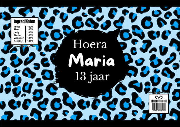 Trakteer in stijl met deze unieke blauw met zwarte panterprint chipswikkel! De wikkel wordt gepersonaliseerd met naam en leeftijd en is kant-en-klaar gevuld met een heerlijk zakje chips. Perfect voor een verjaardag, schoolfeest of sportieve traktatie!