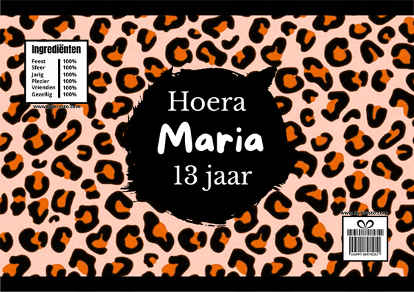 Trakteer in stijl met deze unieke Oranje met zwarte panterprint chipswikkel! De wikkel wordt gepersonaliseerd met naam en leeftijd en is kant-en-klaar gevuld met een heerlijk zakje chips. Perfect voor een verjaardag, schoolfeest of sportieve traktatie!